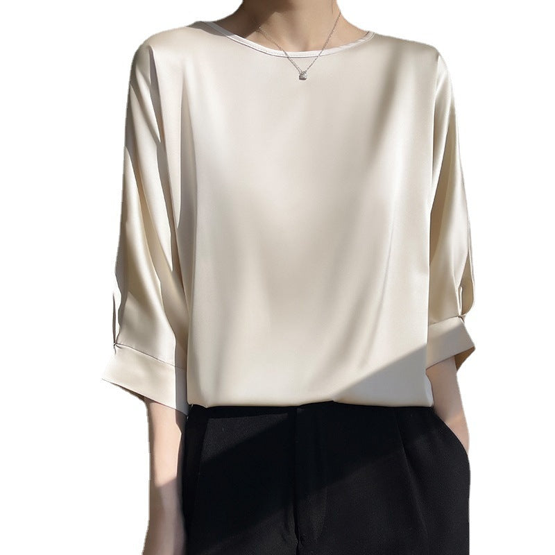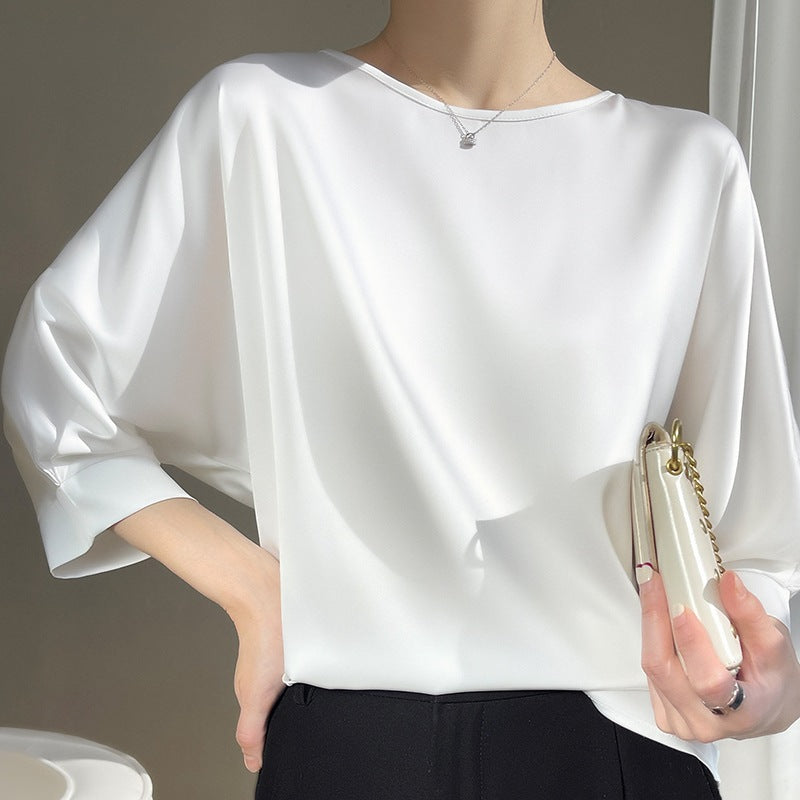 Blusa elegante de media manga con acabado satinado que aporta un toque sofisticado y femenino a tu look. Su diseño ligero y fluido se adapta tanto a ocasiones formales como casuales, ideal para combinar con faldas o pantalones.