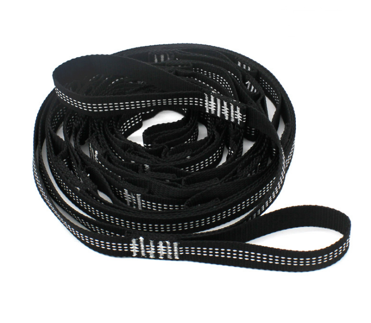 Hamaca para exteriores con cuerda atada y correa especial para árbol.