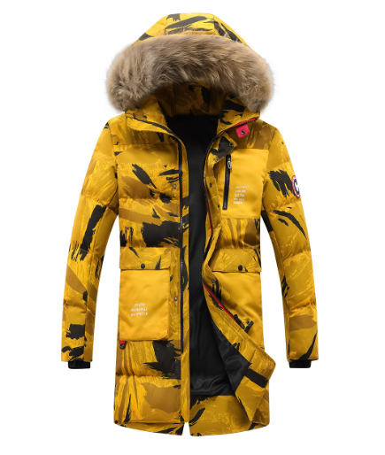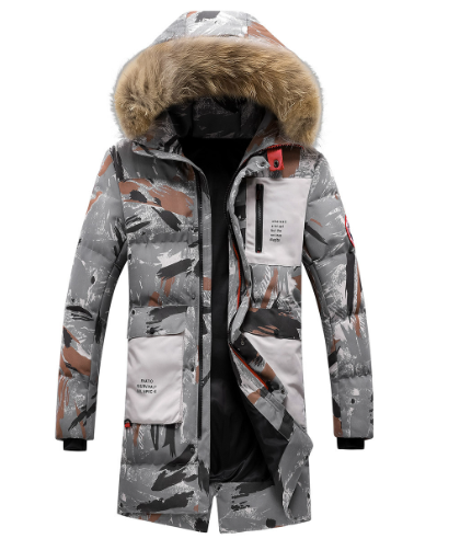 Chaqueta acolchada con capucha y camuflaje grueso.