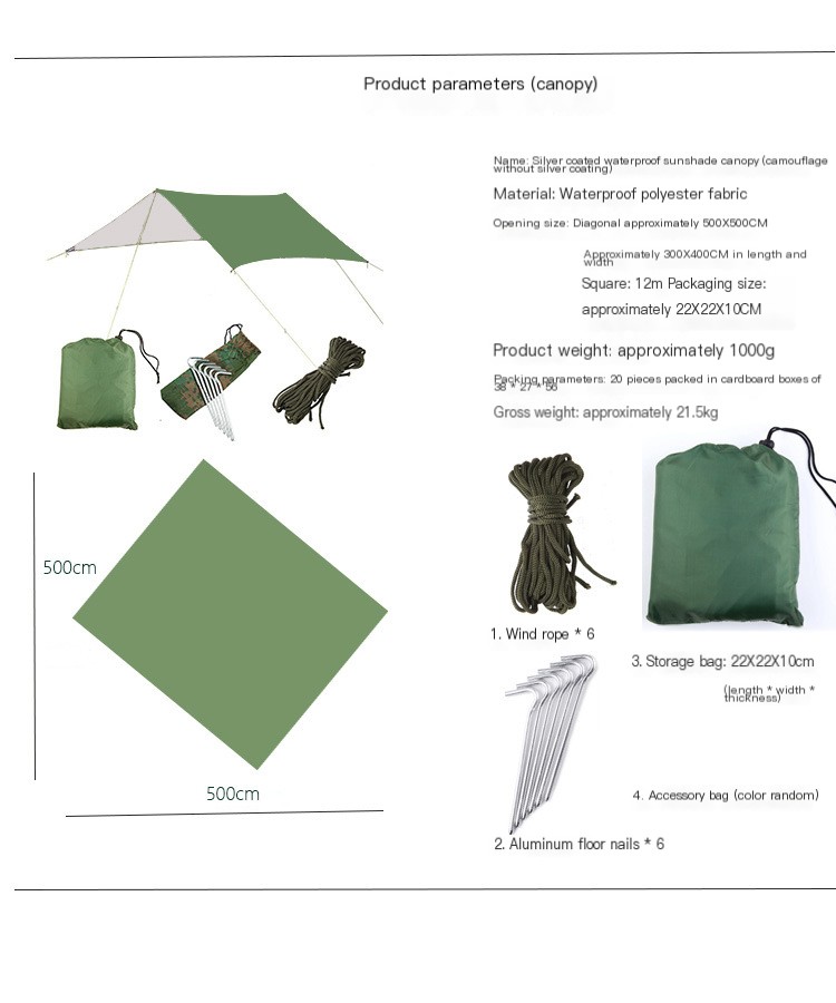 Toldo cuadrado multifuncional para exteriores, impermeable, protector solar, para playa, pérgola, sombrilla, carpa ligera con revestimiento de plata, alfombra de piso de tela - Verde / 300*300cm está agotado y se enviará tan pronto como vuelva a estar disponible.