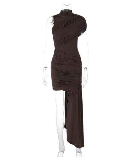 Vestido mini con fruncido irregular para mujer, elegante, de cuello alto, sin mangas, de cintura alta, plisado, para fiesta y club. - Caqui / XS está agotado y se enviará tan pronto como vuelva a estar disponible.