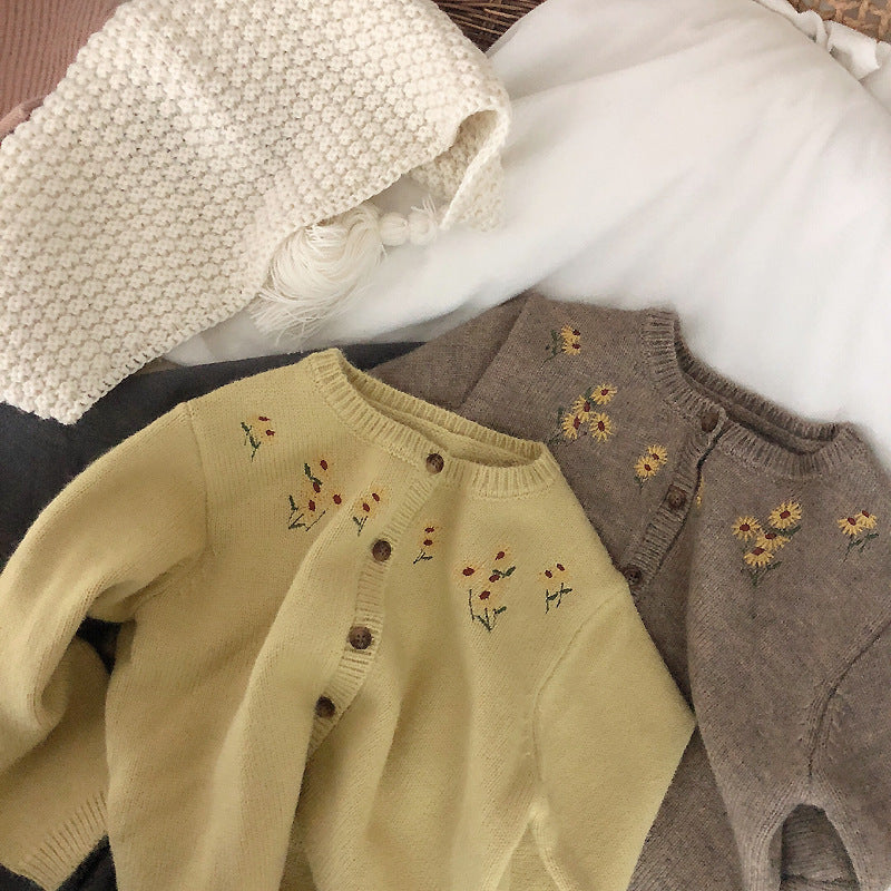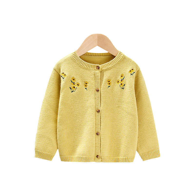 Este abrigo de punto para niña es perfecto para los días frescos de primavera y otoño. Su diseño con delicados bordados florales le da un toque tierno y elegante, ideal para complementar cualquier look infantil.