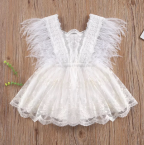Haz de ese día especial un recuerdo inolvidable con este vestido de bautizo de encaje y plumas para niña. Diseñado en un delicado tono blanco, combina encaje elegante con detalles de plumas que le dan un toque angelical y único.