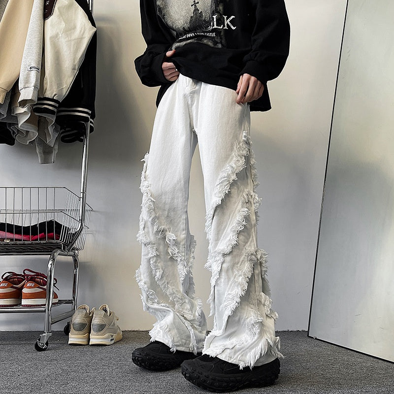 Vaqueros lavados con bordes rugosos y corte ajustado con parches - Blanco / XL está agotado y se enviará tan pronto como vuelva a estar disponible.