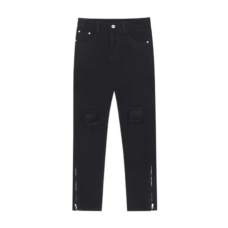 Vaqueros negros de calle con un pequeño agujero en la cremallera