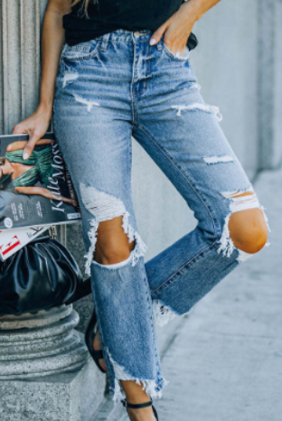 Vaqueros de cintura alta con agujeros en la rodilla y rotos en color azul cielo