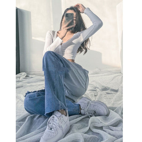 Pantalones vaqueros de cintura alta de color azul claro para viajeros con temperamento