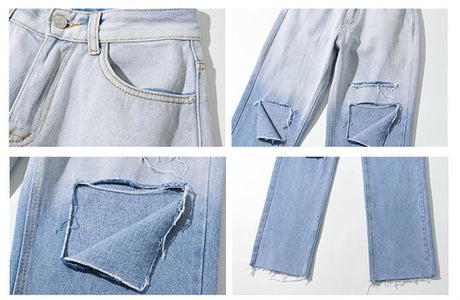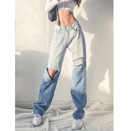 Vaqueros rectos, sueltos, deshilachados y con degradado de cintura alta para mujer