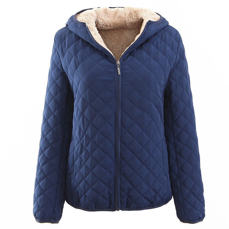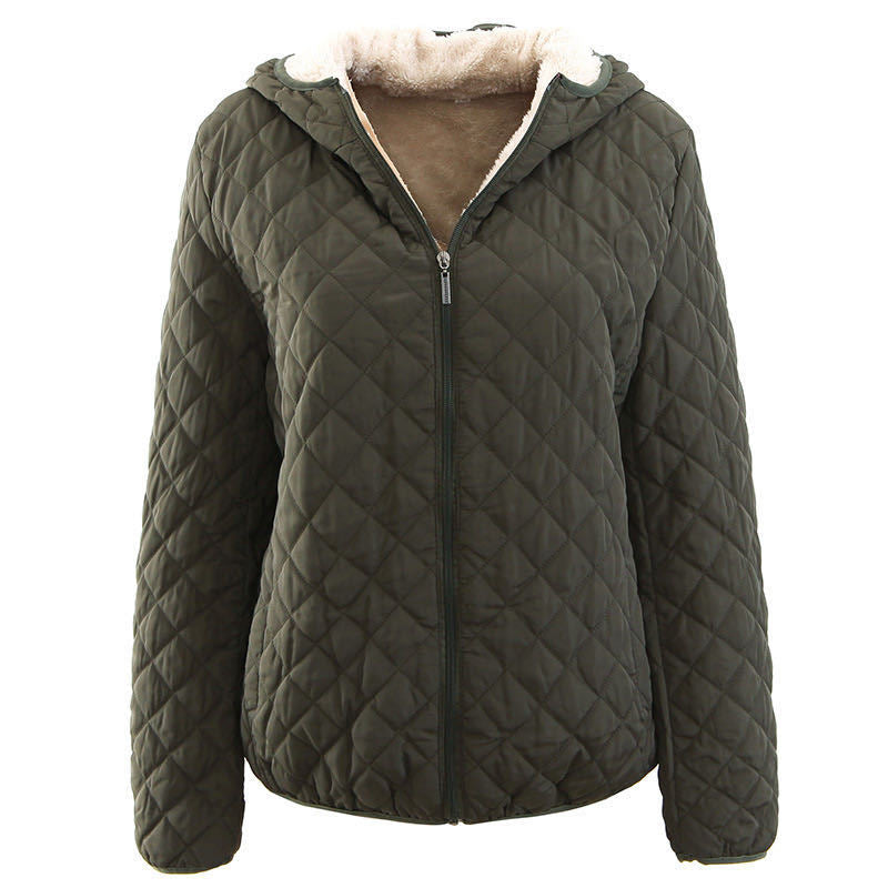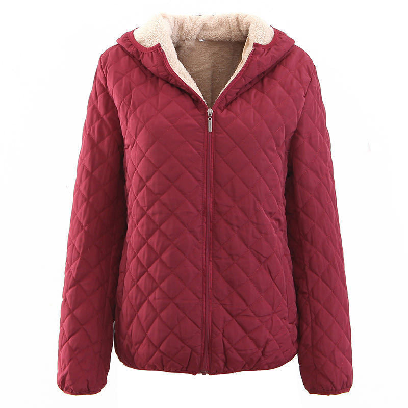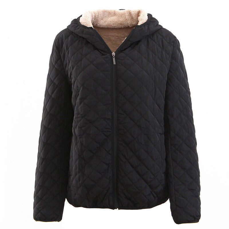 Abrigo de piel de cordero a cuadros ajustado de estilo coreano con capucha y acolchado de algodón cálido para mujer