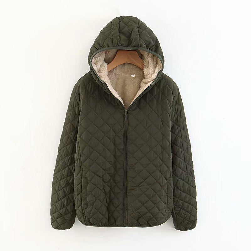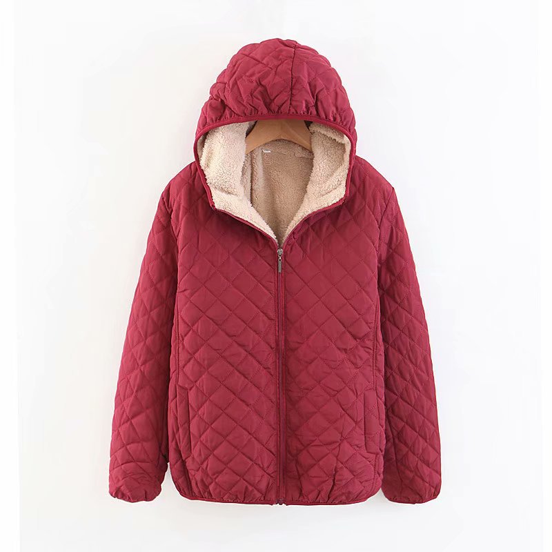 Abrigo acolchado de piel de cordero estilo coreano con capucha. Suave, cálido y ligero, ideal para otoño e invierno con un diseño moderno a cuadros.