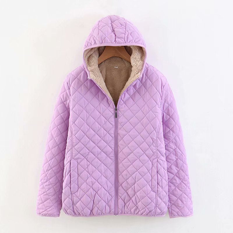 Abrigo de piel de cordero a cuadros ajustado de estilo coreano con capucha y acolchado de algodón cálido para mujer - Morado / Chico está agotado y se enviará tan pronto como vuelva a estar disponible.