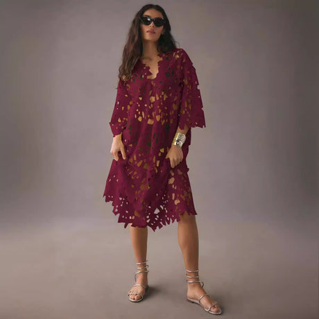 Vestido estampado con cuello en V, cordones y mangas pequeñas con vuelo