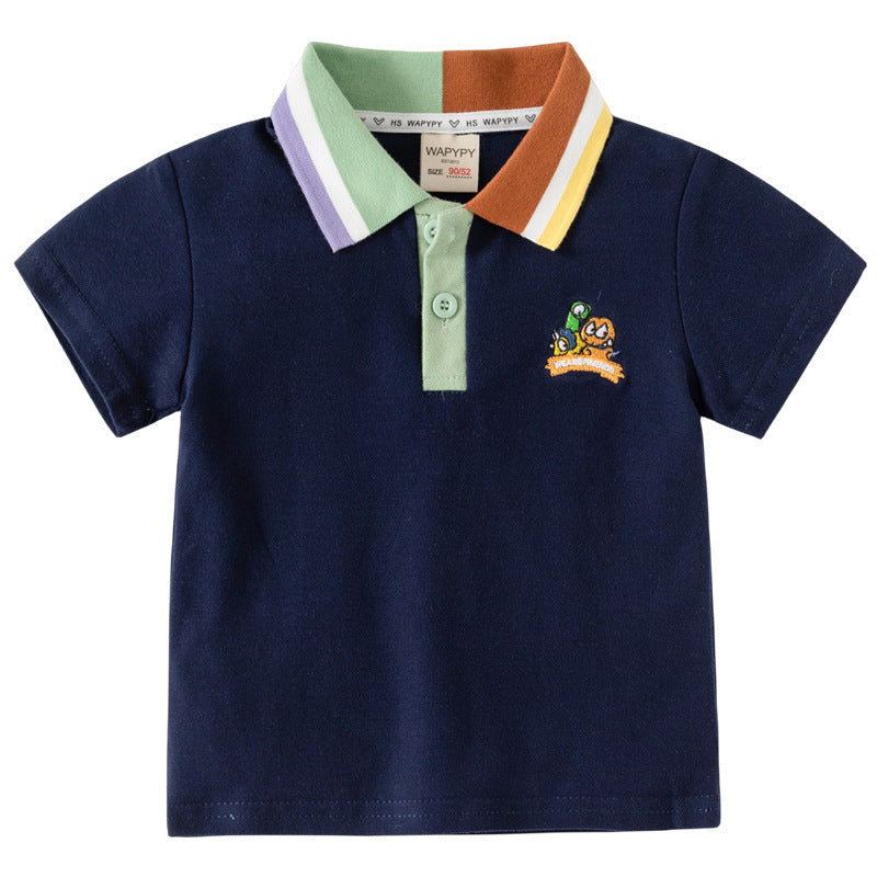 Camiseta de manga corta para niño con cuello de colores y bordado divertido. Una prenda fresca, cómoda y perfecta para cualquier ocasión. Disponible en azul marino y blanco.