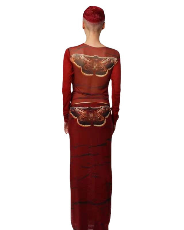 Vestido largo de manga larga con estampado retro y efecto de textura que realza la figura. Su diseño de cintura alta crea una silueta estilizada y sofisticada, ideal para eventos y ocasiones especiales.