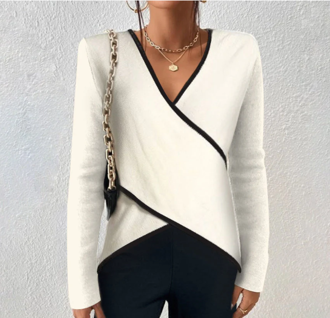 Camiseta de cuello en V con dobladillo cruzado en color liso - Blanco / XXXL está agotado y se enviará tan pronto como vuelva a estar disponible.